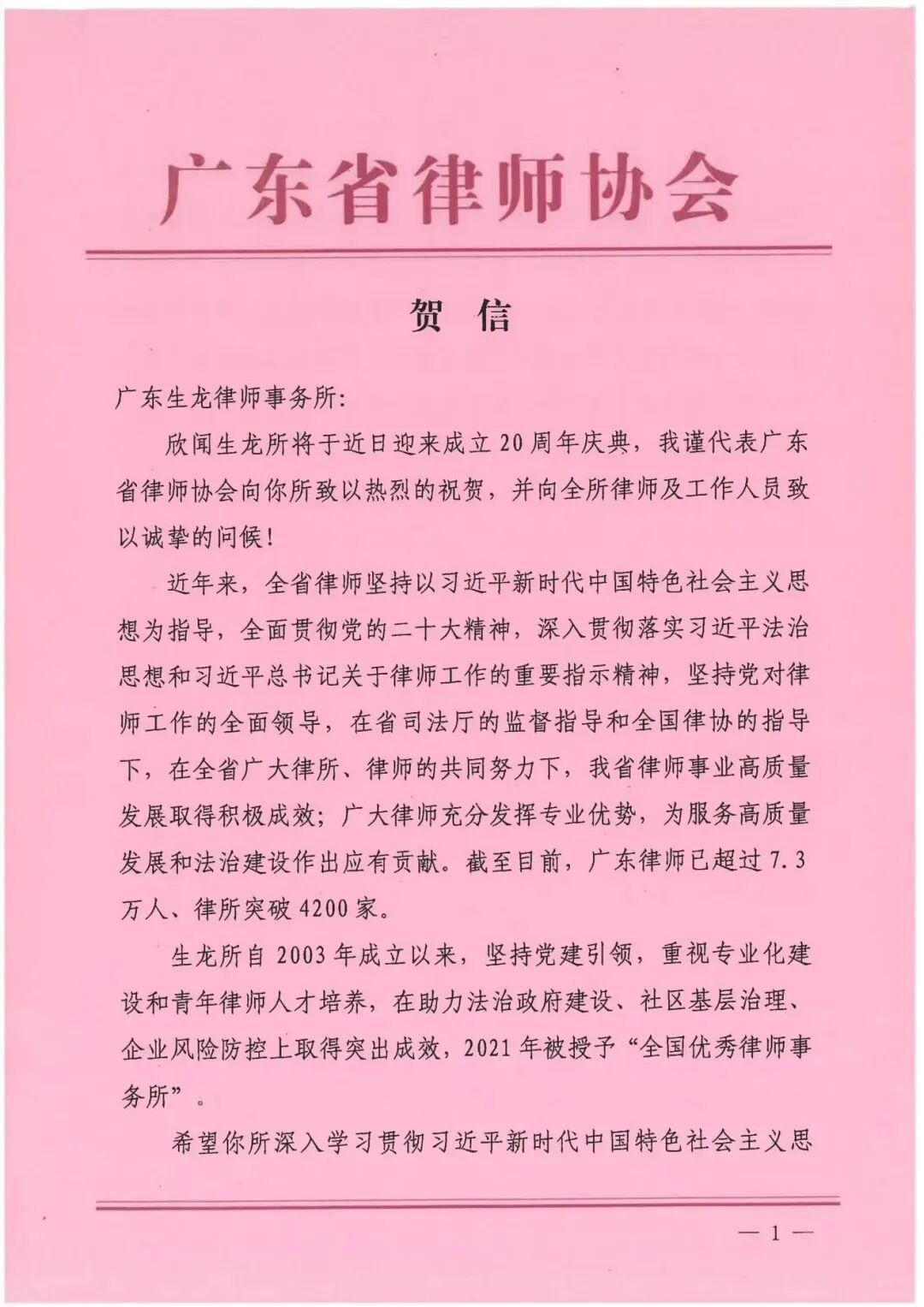 广东省律师协会会长肖胜方发来贺信,对广东生龙律师事务所成立20周年表示热烈祝贺,并对广东生龙律师事务所的发展提出了更高的要求,希望广东生龙律师事务所为高质量发展和广东律师事业做出更大的贡献。
