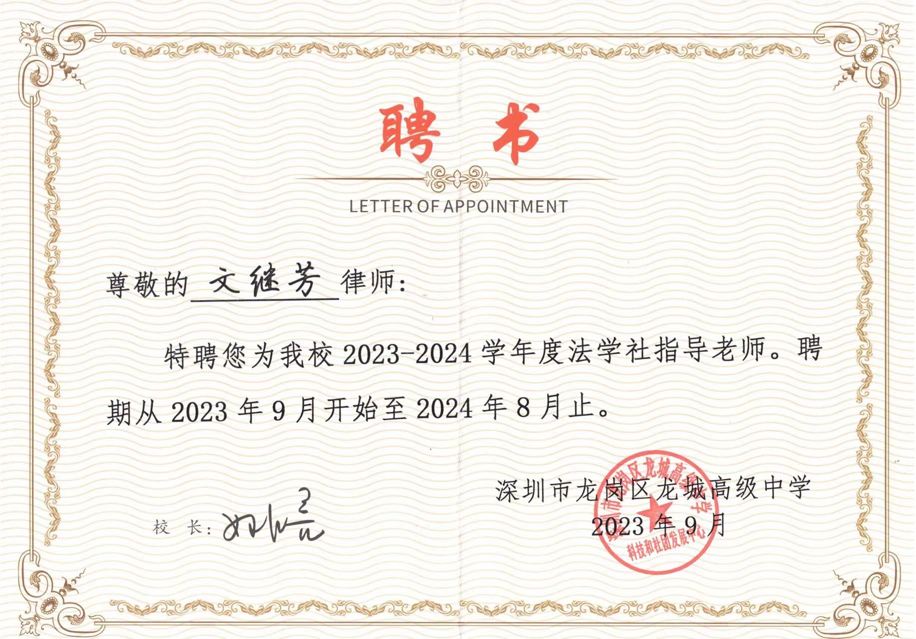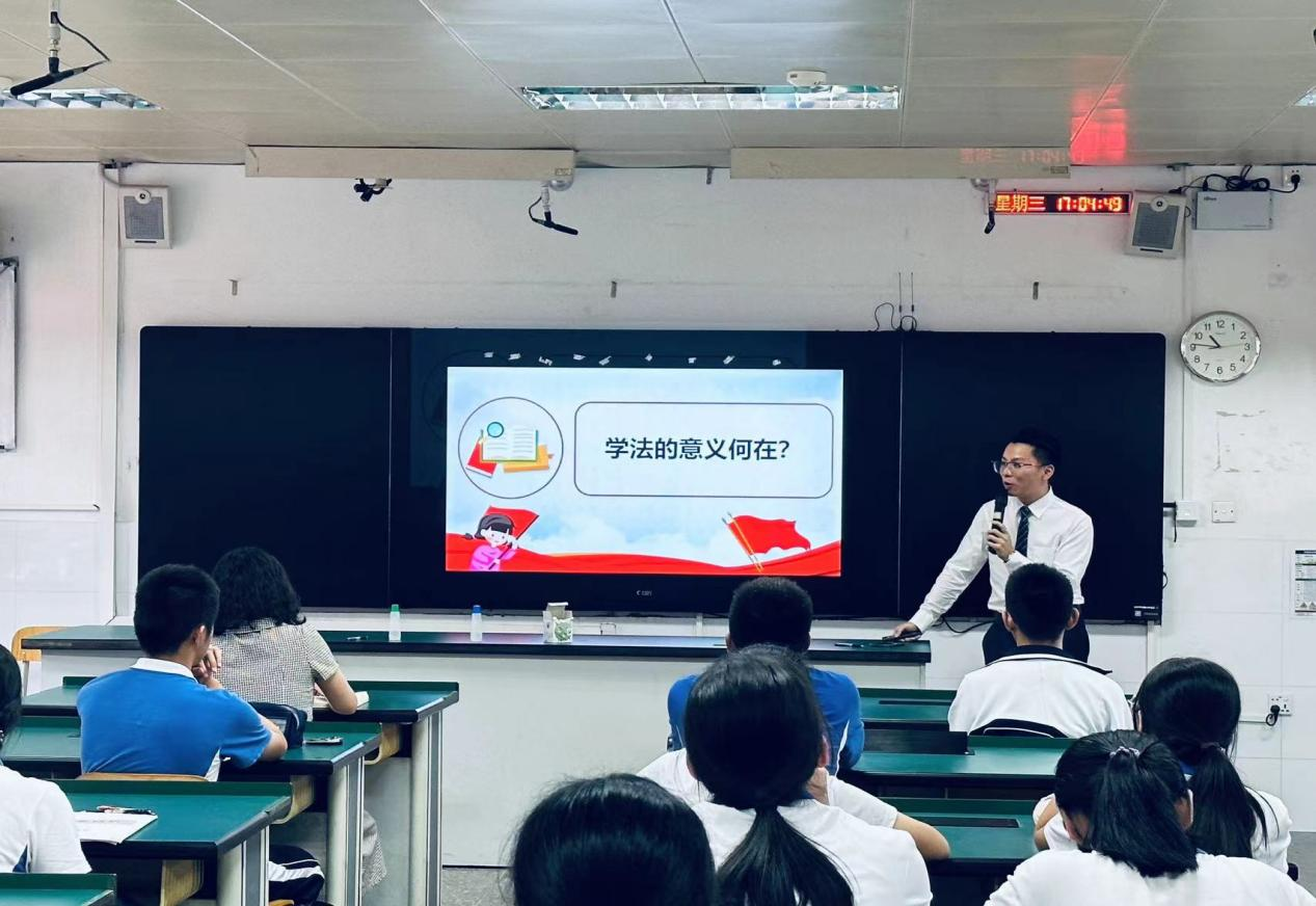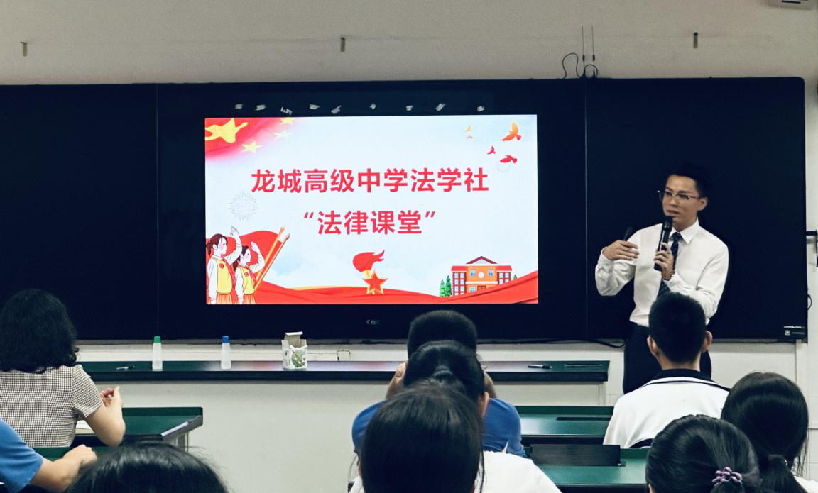 青少年是祖国的未来、民族的希望,党的十八大以来,以习近平同志为核心的党中央高度重视青少年法治教育工作。因此,为了帮助广大青少年学生养成自觉守法、遇事找法、解决问题靠法的思维习惯和行为方式,深圳市龙岗区龙城高级中学法学社应运而生,并聘请了广东生龙律师事务所唐勤华律师、文继芳律师为指导老师,每周三最后一节课为同学们上生动有趣的法治课。在龙城高级中学杨林老师的积极推动下,2023年9月20日下午4点45分,法学社“法律课堂”diyi节课如期而至。