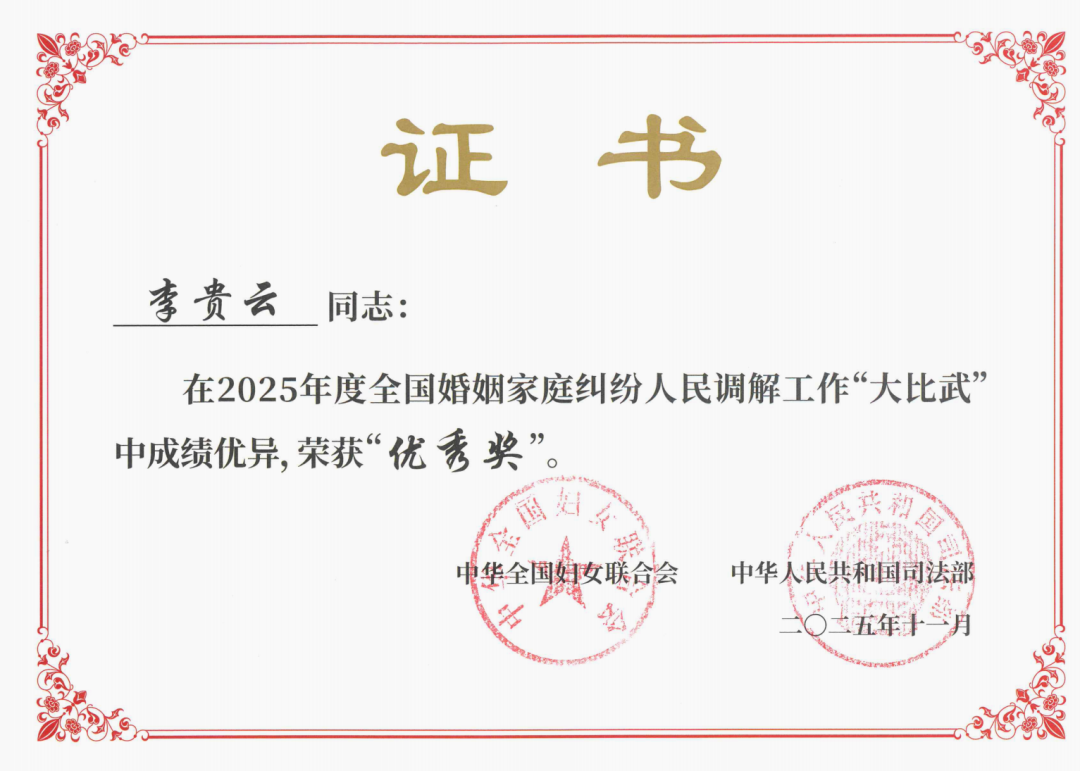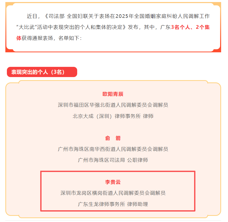 近日,司法部、全国妇联联合发布《关于表扬在2025年全国婚姻家庭纠纷人民调解工作“大比武”活动中表现突出的个人和集体的决定》,广东生龙律师事务所的李贵云凭借在该活动中荣获优 秀奖的出色表现,荣获司法部、全国妇联联合通报表扬。